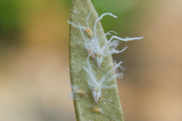ตัวอ่อน: มีขนาดเล็กกว่าตัวเต็มวัย มีปุยสีขาวคล้ายหางไก่ติดอยู่ที่ส่วนท้ายของลำตัว ตัวอ่อนจะดูดกินน้ำเลี้ยงจากใบอ่อน