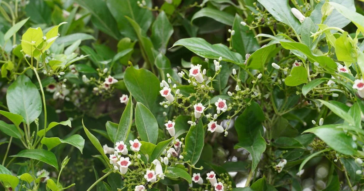 - ดอก: ออกเป็นช่อที่ปลายกิ่งหรือซอกใบ ดอกมีขนาดเล็ก กลีบดอกสีขาวหรือชมพูอ่อน ด้านในสีม่วง เป็นรูปกรวย ปลายแยกเป็น 5 แฉก